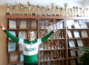 „Reikia būti beveik šventam, su šventa kantrybe, šventu atjautimu“, – pagalvoju. Dar nueiname į koridorių prie apdovanojimų stendų padaryti nuotraukos, o tų apdovanojimų, padėkų, medalių, taurių yra pilni jos namai čia ir gimtinėje.