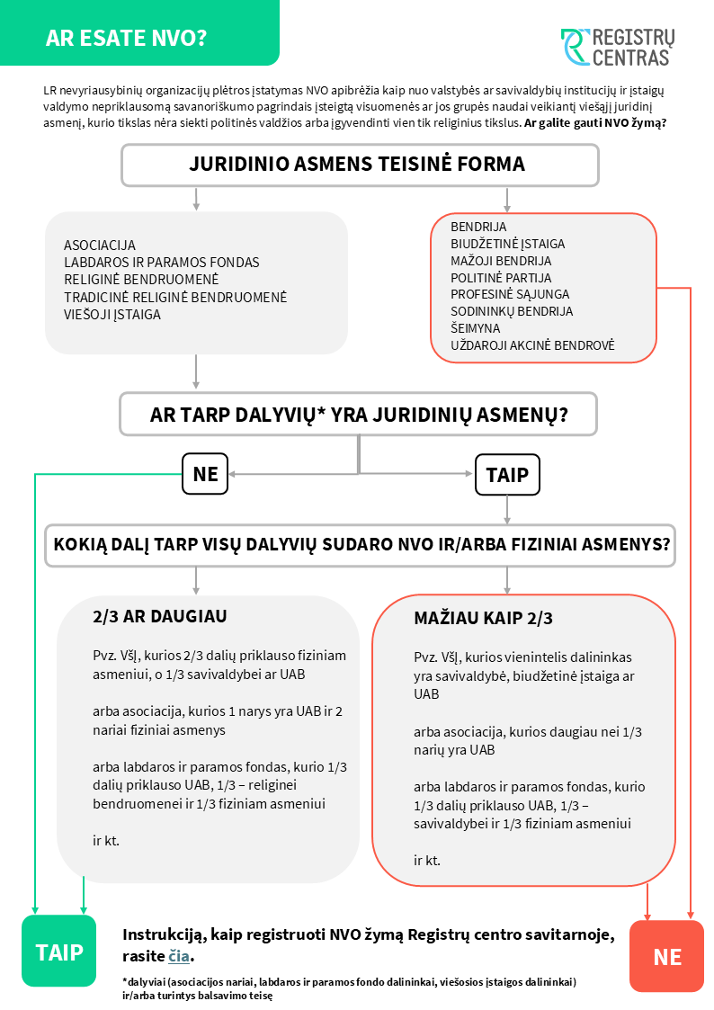 „Prieš kreipiantis į Registrų centrą registruoti NVO žymą, juridinio asmens vadovas turi pats įsivertinti, ar atitinka įstatyme apibrėžtą nevyriausybinės organizacijos sąvoką.