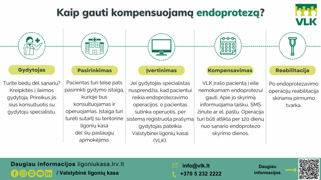 Jei ortopedas traumatologas nustato, kad operacija būtina, šis gydytojas pats užregistruoja paciento prašymą dėl kompensuojamo endoprotezo Valstybinės ligonių kasos informacinėje sistemoje.