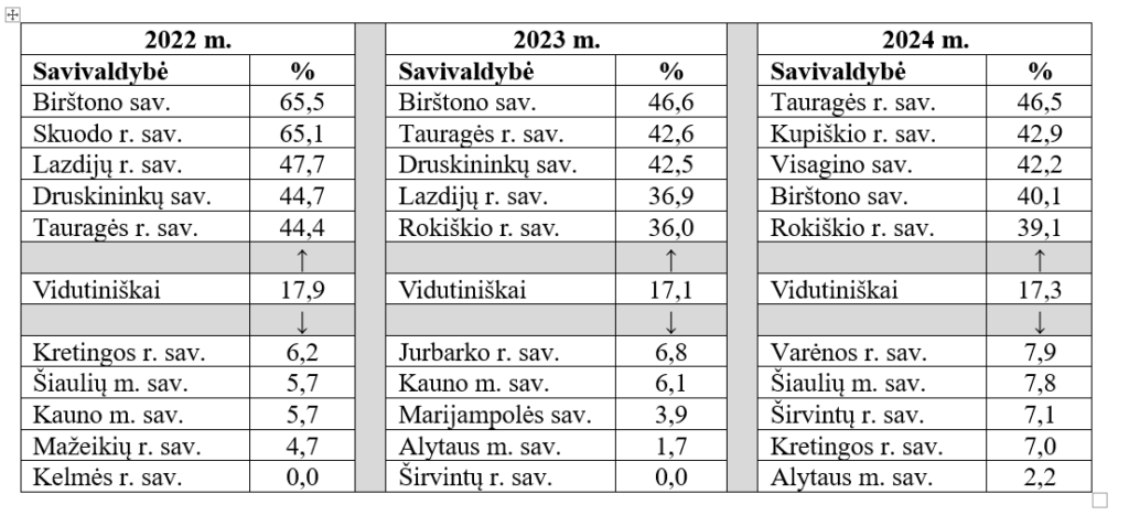 Tuo tarpu Alytaus m. savivaldybėje minėtose stovyklose buvo vos 2,2 proc. mokinių, toliau rikiuojasi Kretingos r. sav. ir Širvintų r. sav. – atitinkamai 7 ir 7,1 proc.
