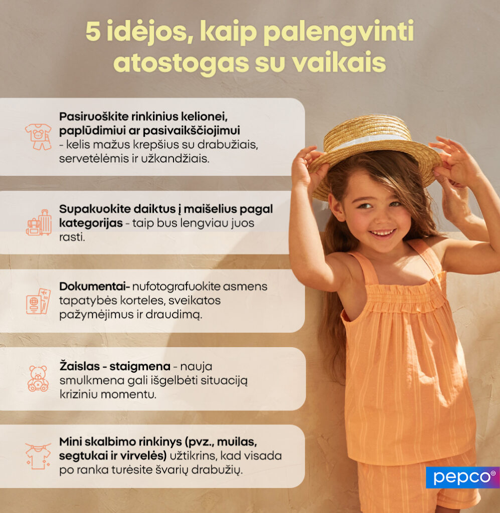 Per atostogas su vaikais visada pasitaiko, kad ką nors pamirštate arba ką nors reikia turėti po ranka, apie ką nepagalvojote. Todėl prieš išvykstant verta užsukti į „Pepco“ parduotuvę ir paieškoti priedų ir smulkmenų, kurios gali išgelbėti ne vieną situaciją. Spalvingos gertuvės, maišeliai smulkmenoms, mini užkandžių indeliai, rankšluosčiai su vaikiškais motyvais ar lengvi atostogų drabužiai – tai daiktai, kurie neužims daug vietos, bet gali būti neįkainojami.