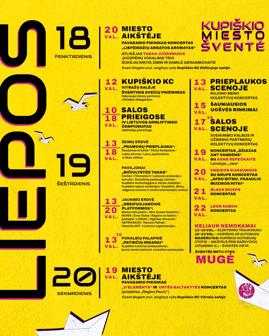 20 val. L. Stuokos-Gucevičiaus aikštėje – pavakario piknikas-koncertas „Liepžiedžių arbatos aromatas“. Liepžiedžių arbatą skanausime drauge su Juodpėnų vokaliniu trio, daugkartiniais Lietuvos ir Latvijos sportinių šokių varžybų nugalėtojais ir prizininkais Nikita Zimin ir Kamile Gerasimovaite, dainininku, aktoriumi, įvairių televizijos projektų dalyviu Tadu Juodsnukiu.