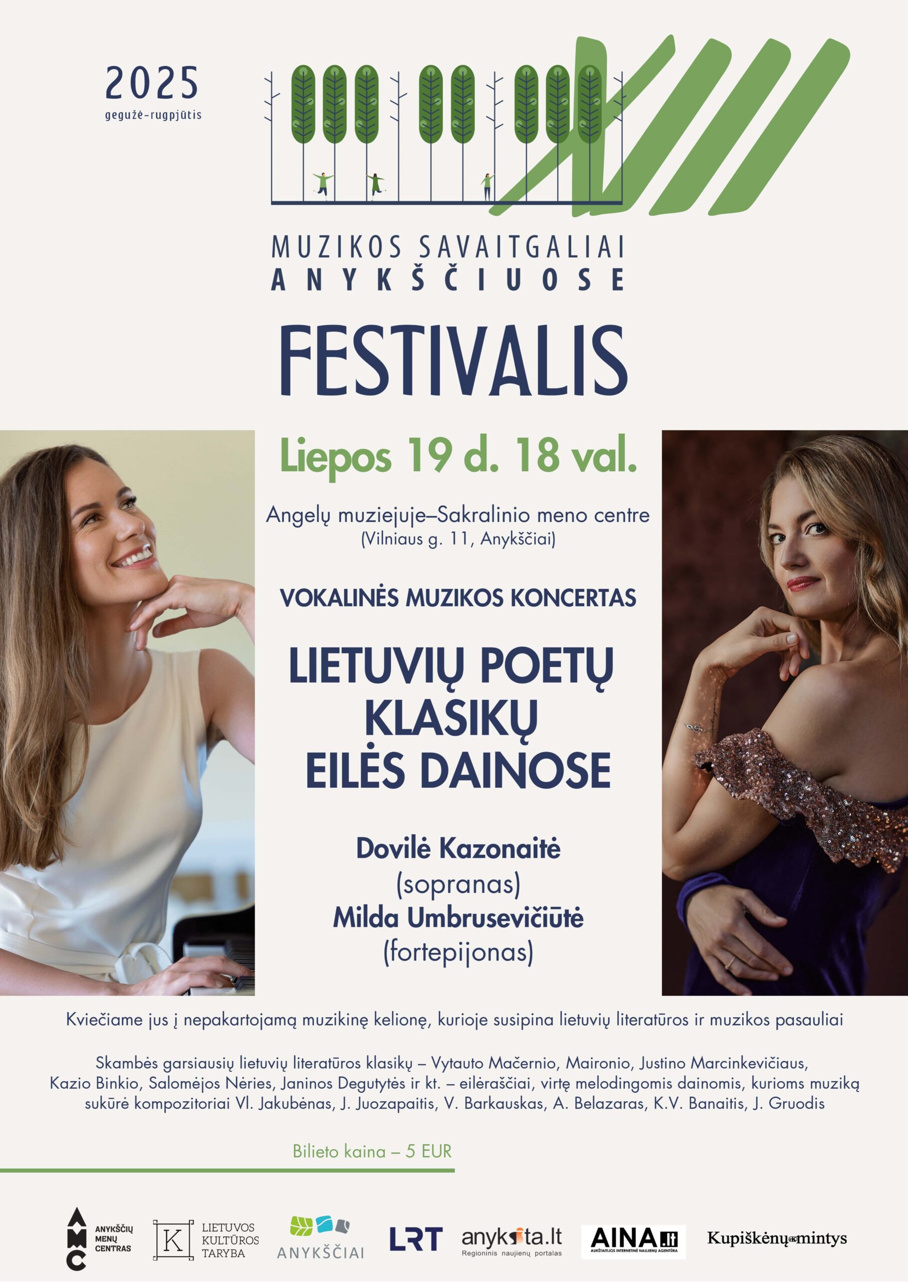 Liepos 19 d. 18 val. Angelų muziejuje-Sakralinio meno centre (Vilniaus g. 11, Anykščiai) vyksiančiame koncerte skambės garsiausių lietuvių literatūros klasikų – Salomėjos Nėries, Vytauto Mačernio, Kazio Binkio, Justino Marcinkevičiaus ir kitų poetų – eilėraščiai, virtę melodingomis ir širdį virpinančiomis dainomis, kurių muziką sukūrė tautos kompozitoriai klasikai: Vl. Jakubėnas, J. Juozapaitis, A. Belazaras, K.V. Banaitis, J. Gruodis.