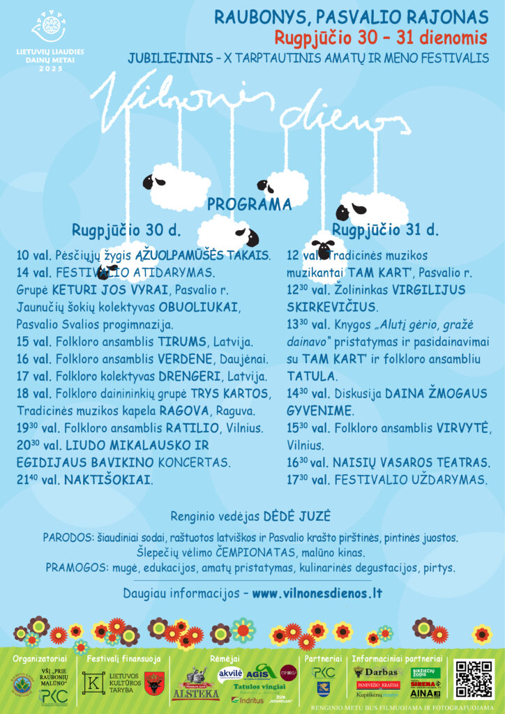 Rugpjūčio 30–31 dienomis Pasvalio rajone, Raubonių kaime, prie kultūros paveldo objekto – vandens malūno su vilnų karšykla-verpykla – vyks jubiliejinis, dešimtasis tarptautinis amatų ir meno festivalis „Vilnonės dienos“, tituluojamas švelniausiu Lietuvos festivaliu. Organizatoriai kviečia pasinerti į bendrystės, tradicijų ir muzikos kupiną šventę, kurioje susitinka senieji amatai, folkloras ir šiuolaikinės kūrybinės interpretacijos.