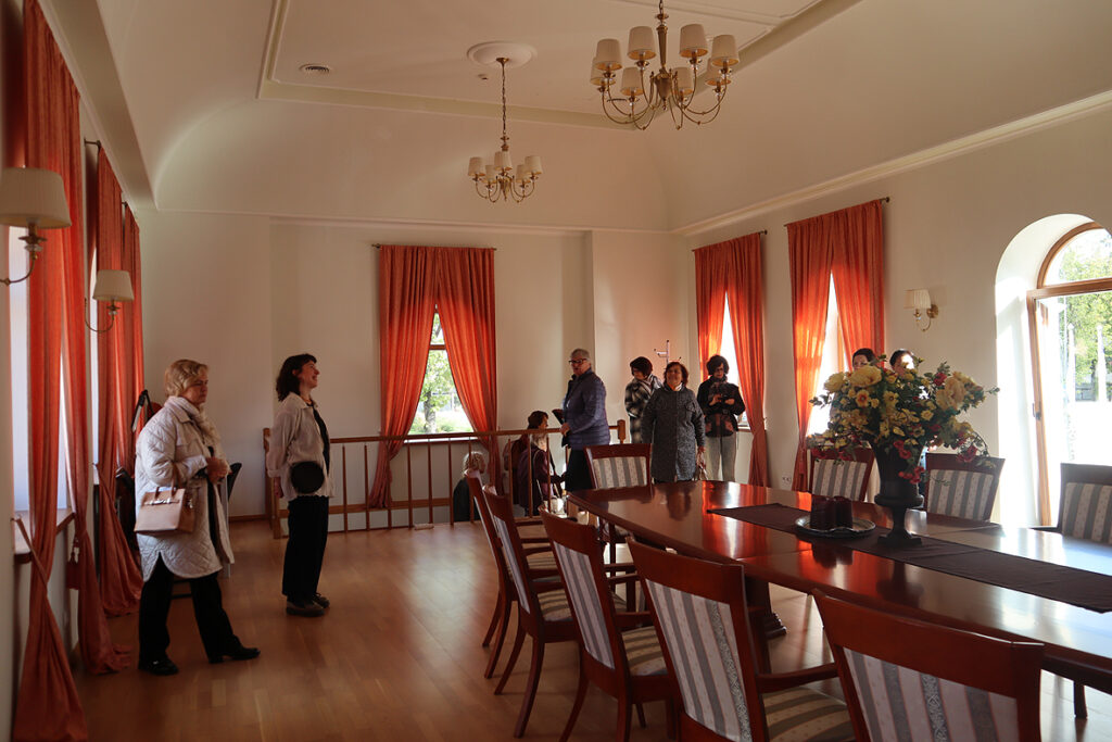 Pirmame jo aukšte, kur yra keli darbo kabinetai, ekskursantai taip pat neužsibuvo ir laiptais užkopė į antrą aukštą, kurio visą plotą užima viena salė.