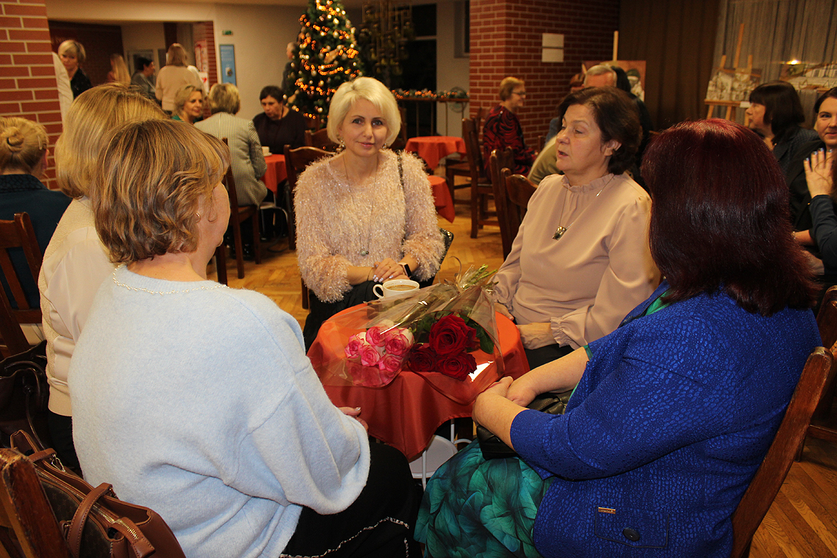 Padėkos vakaro pradžioje mokytojai fotografavosi prie fotosienelės, vaišinosi kava.
