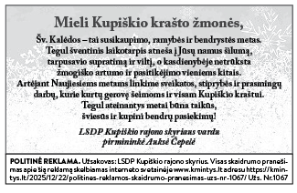 Laikotarpis, kurį politinės reklamos skelbimą numatoma publikuoti, pateikti ar platinti: sveikinimo paskelbimas 2025-12-23 laikraštyje „Kupiškėnų mintys“.