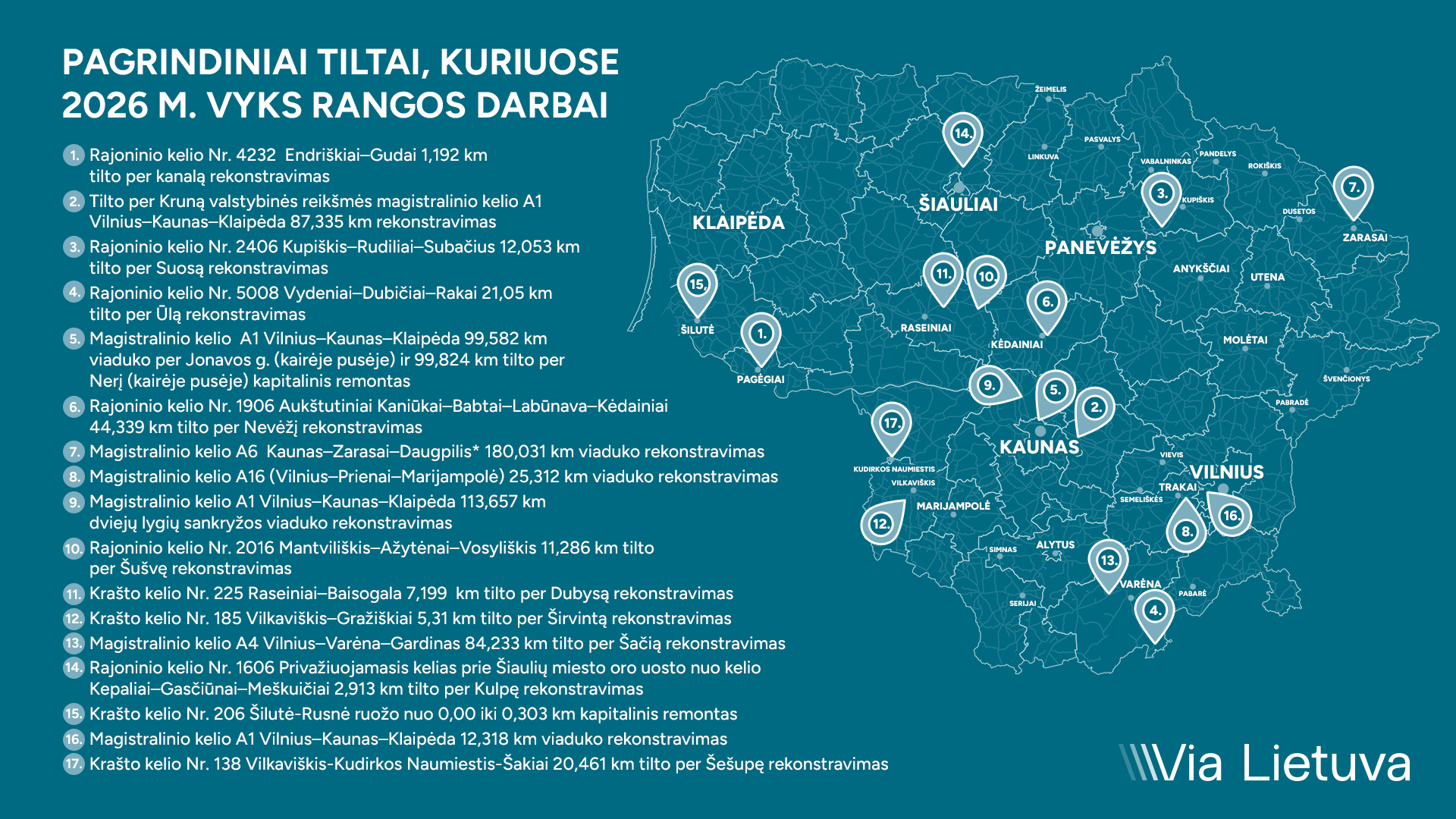„2026-ieji – tiltų tvarkymo metai. Tiltai ir viadukai nėra tik atskiri infrastruktūros objektai – jie sudaro visos šalies kelių sistemos stuburą ir turi tiesioginę įtaką eismo saugumui, regionų pasiekiamumui bei nacionaliniam saugumui. Delsimas kainuoja per brangiai, todėl nuosekliai investuodami į tiltų ir viadukų atnaujinimą mes ne tik šaliname dešimtmečiais kauptas problemas, bet ir kuriame patikimą bei saugią infrastruktūrą ateities kartoms“, – pabrėžia „Via Lietuva“ vadovas Martynas Gedaminskas.