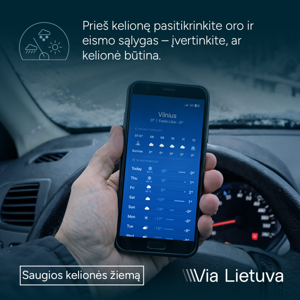 Saugios kelionės prasideda nuo plano. Prieš išvykstant patariama pasitikrinti oro ir eismo sąlygas bei, jei įmanoma, išvažiuoti anksčiau, kad nereikėtų skubėti.