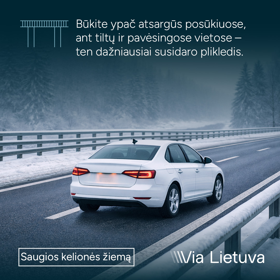 Kelyje svarbu rinktis saugų greitį, laikytis didesnio atstumo, vengti staigių manevrų ir būti ypač atidiems pavojingose vietose – posūkiuose, ant tiltų ar pavėsingose atkarpose, kur dažnai susidaro plikledis.