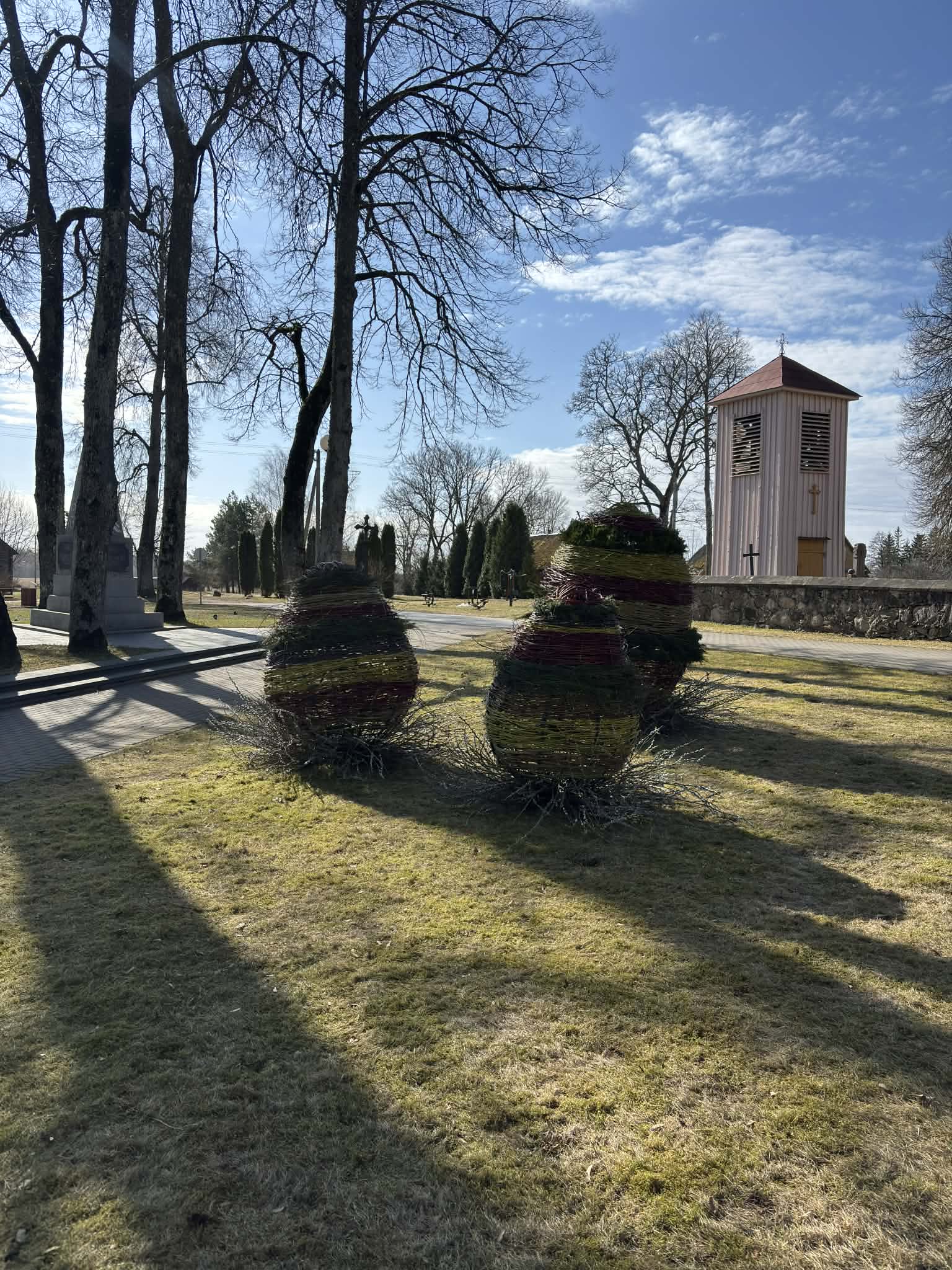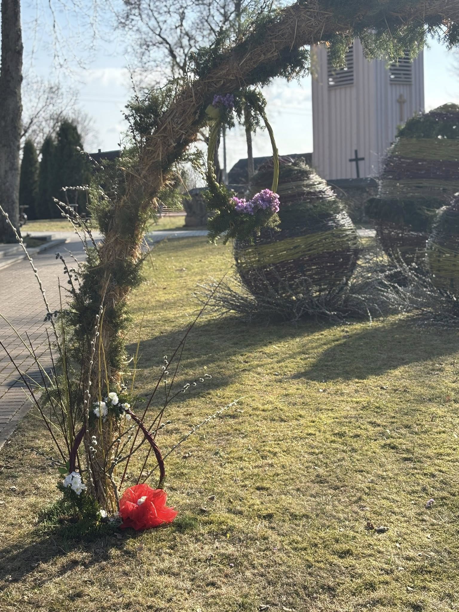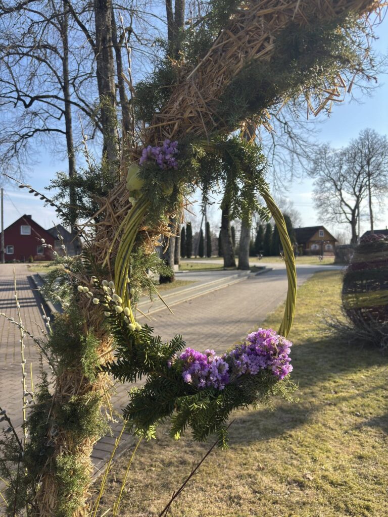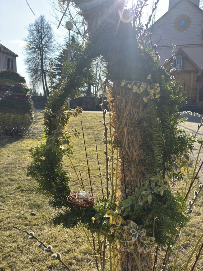Šimonis papuošė margučiai – originalūs, masyvūs, padaryti iš gamtinių medžiagų. Tai Šimonių seniūnijos darbuotojų sumanymas.