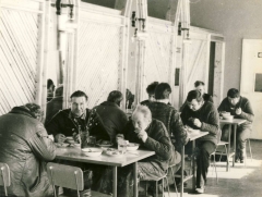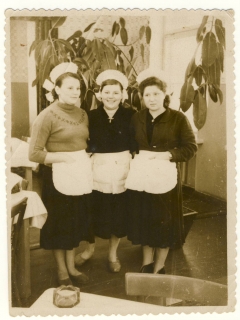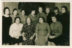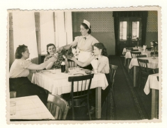 Kupiškio restorano kolektyvas 1960 metais. Iš kairės sėdi virėjos V. Mažeikienė, Apolonija Ridikienė, direktorė A. Bukėnienė, virėja N. Mesgienė. Stovi iš kairės virtuvės darbininkė Palmutė, virėjos Veronika Kazlauskienė, Emilija Vogulienė, Bronė Gurklienė, Bronė Vilimienė, Onutė Jonušienė, Zina Lukšienė, buhalterė Mekienė. Nuotrauka iš Janinos Varnienės asmeninio archyvo
