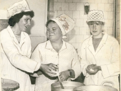 VirÄ—jų mokyklos moksleivÄ—s R. DžiovalytÄ— ir Zina PuÄetaitÄ— gamybinių darbų metu KupiÅ¡kio restorano „KupiÅ¡kÄ—nų svetainė“ valgykloje su gamybinio mokymo instruktore vyr. virÄ—ja Lidija Jankauskiene apie 1987 metus.