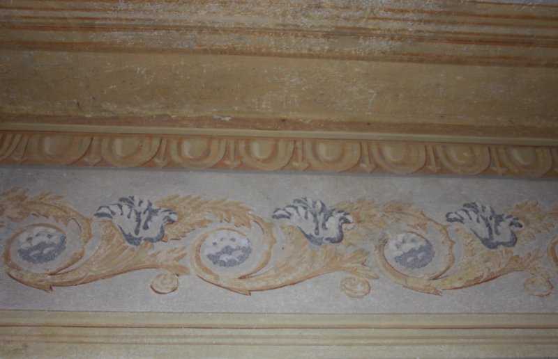 Sienos puošyba prie lubų dvaro rūmų salėje.
