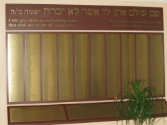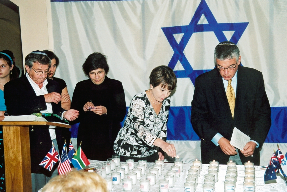 Kupiškio žydų palikuonys uždega žvakutes prie savo nužudytų protėvių atminimo lentos Kupiškio viešojoje bibliotekoje. Pirmas iš kairės susitikimo Kupiškyje organizatorius Normanas Mėjeris. 2004 07 13. Juozo Kraujūno nuotrauka iš Kupiškio etnografijos muziejaus archyvo