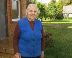 Janina StirkienÄ— prie gražiai tvarkomos sodybos. „Šis vienkiemis jau mirusio mano vyro Antano tÄ—viÅ¡kÄ—. ÄŒia apsigyvenau 1967 metais. Gal deÅ¡imt metų kartu gyvenome su vyro mama Ona Stirkiene. Stirkos, jei bÅ«tų gyvi, tai tikrai daug kÄ… apie Skverbų praeitį bÅ«tų galÄ—jÄ™ papasakoti. Mano vyras visÄ… gyvenimÄ… dirbo vairuotoju, buvo net asmeninis tuometinio kolÅ«kio pirmininko Emilijono Dyros vairuotojas. AÅ¡, kol vaikai augo, triÅ«siau namie, o vÄ—liau dirbau kolÅ«kio brigadoje, fermoje. SusilaukÄ—me trijų vaikų – dukrų Gelminos (buhalterÄ—, gyvena Kaune) ir Redos (medikÄ—, gyvena KupiÅ¡kyje, dirba Panevėžyje) bei sÅ«naus Remigijaus. Jis įsikÅ«rÄ™s Panevėžyje ir labiausiai su marÄia man padeda sodyboje tvarkytis. Abu yra įgijÄ™ agronomo specialybÄ™. Tas alpinariumas – marÄios kÅ«ryba. VasarÄ… daug Å¡ienavimo. Turime didelį kluonÄ…. ŽemÄ™ nuomojame. Kalbinu sÅ«nų, kad grįžtų į Skverbus gyventi, perimtų Å«kį, bet iÅ¡ miesto jis visgi kraustytis neketina. O mano Å«kelis dabar kuklus – 6 viÅ¡tos, katinas ir Å¡uo“, – pasakojo apie save paÅ¡nekovÄ—. Paklausta, ar netrukdo nuolat keliu Panevėžio ir KupiÅ¡kio link zujanÄios maÅ¡inos, moteris sako jų lyg ir negirdinti, pripratusi prie to ūžimo. Ji džiaugiasi, kad yra nuolat vaikų lankoma, prižiÅ«rima. Nebepasigendanti ir kaskart į kaimÄ… užsukanÄios automobilinÄ—s parduotuvÄ—s. ViskÄ…, ko prireikia, parÅ«pina vaikai. Pasak J. StirkienÄ—s, gaila, kad dalis sodybų nyksta. Antai artimiausia jiems Å imonių sodyba liko be žmonių. Pastaruoju metu ten gyvenÄ™s ir Å«kininkavÄ™s Zenonas Å imonis iÅ¡važiavo gyventi į Panevėžį. Moteris su nostalgija prisiminÄ— buvusius kaimo suÄ—jimus. Kaskart žmonÄ—s vieni kitus pasikviesdavo į balius. Kaimynai su kaimynais sueidavo. Ä®vairius jubiliejus, sukaktis ne kartÄ… teko Å¡vÄ™sti su ÄŒepeliais, Rušėnais, Å imoniais, JuzulÄ—niene, Grybauskiene. Daugelio iÅ¡ senų biÄiulių jau nebÄ—ra. Kaimas labai stipriai atsinaujinÄ™s. Visų žmonių ir nebepažįstanti artimiau, gal tik iÅ¡ matymo. Paskutinį kartÄ… skverbieÄiai buvo susirinkÄ™ 2010 metais kaimo kryžiaus atnaujinimo proga.