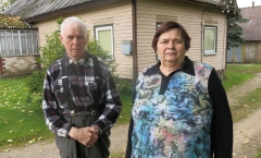 Vilius ir DanutÄ— ÄŒepelÄ—s prie savo namų. IÅ¡ Stirkų vienkiemio patraukiu į kitÄ… Skverbų kaimo galÄ… pas Vilių ÄŒepelÄ™, kuris taip pat yra vienas iÅ¡ Å¡io kaimo senbuvių. VyriÅ¡kis sutinka pasikalbÄ—ti. PakvieÄia į vidų. Jo žmona DanutÄ— pasiÅ«lo kavos ir pamažu užsimezga pokalbis. PaaiÅ¡kÄ—ja, kad Vilius kilÄ™s iÅ¡ netoli nuo Äia, prie geležinkelio, įsikÅ«rusio Žvirblionių kaimo. Atsiradimas Skverbuose buvÄ™s priverstinis. TÄ—viÅ¡kÄ™ reikÄ—jo nugriauti dÄ—l melioracijos ir persikelti. TÄ—vai nusipirko Skverbuose senÄ… Petro Petronio sodybÄ…. Ji iÅ¡sidÄ—sÄiusi abipus kelio ir iÅ¡ kitų iÅ¡siskiria dideliu moliniu tvartu. „Buvau pradÄ—jÄ™s Å«kininkauti. LaikÄ—me 8 karves. Net europinÄ™ paramÄ… technikai įsigyti buvau gavÄ™s. Mat reikÄ—jo Å¡ienauti nemažus plotus. TaÄiau užpuolÄ— ligos ir teko Å«kio atsisakyti. Dabar turime tik viÅ¡tų, putpelių ir du Å¡unis. Vaikai Å«kininkauti nepanoro. Taip pat daug metų esu dirbÄ™s miÅ¡kininku. Buvau ir GirÄ—nų girininkijos girininko pavaduotojas. Esu baigÄ™s tuometinį Vabalninko žemÄ—s Å«kio technikumÄ…, miÅ¡kininkystÄ—s kursus. Skverbuose pripratome, sutariame su kaimynais. ÄŒia gera vieta. Gaila tik, kad pamažu kaimas tuÅ¡tÄ—ja. Yra ir negyvenamų sodybų. Kai kurios atgyja tik Å¡iltuoju metų laiku. VasarÄ… atvažiuoja TamoÅ¡iÅ«no marti, KopÅ«sto dukra, Rušėno sodyboje vasaroja žmonÄ—s iÅ¡ Panevėžio. Vilties teikia Äia atsikraustantys nauji nuolatiniai gyventojai. Labai gražiai sodybÄ… tvarko jauna Kireilių Å¡eima. Nuo jų neatsilieka irgi jaunos DuraseviÄių, Mikonių Å¡eimos. Vis dÄ—lto Å«kininkauti, laikyti gyvulių žmonÄ—s nebenori. KeiÄiasi įstatymai, sunku senesniems tvarkytis ir tas žemdirbio triÅ«sas nelabai vertinamas. Antai kaime tik vienintelÄ— RiaubienÄ— karvutÄ™ tebelaiko. Greitai šį gyvulį Lietuvoje bus galima į RaudonÄ…jÄ… knygÄ… įraÅ¡yti“, – kalbÄ—jo paÅ¡nekovas apie kaimo gyvenimÄ…. DanutÄ— daug metų dÄ—stÄ— lietuvių kalbÄ… ir literatÅ«rÄ… SubaÄiaus mokykloje. Moteris papasakojo, kad yra žemaitÄ— iÅ¡ KlaipÄ—dos rajono. GimÄ— Lapių kaime. Dirbo netoli tÄ—viÅ¡kÄ—s, Plikių mokykloje. Su Viliumi jÄ… supažindino vietinis vaikinas, buvÄ™s jo kariuomenÄ—s draugas. 1971 m. jiedu atÅ¡oko vestuves. Po jų Plikiuose dar keletÄ… metų gyveno. Kai buvo baigtas įrengti namas Skverbuose, persikÄ—lÄ— į vyro tÄ—viÅ¡kÄ™. „TuometinÄ—je SubaÄiaus vidurinÄ—je mokykloje pradÄ—jau dirbti 1974 metais. Užauginome du sÅ«nus ValdÄ… ir RaimondÄ… bei dvi dukras VilmÄ… ir EditÄ…. SÅ«nÅ«s įsikÅ«rÄ™ Panevėžyje, kelininkai. Edita tapo žurnaliste, gyvena Vilniuje, o Vilma dirba siuvÄ—ja ir gyvena SubaÄiuje. Valdas ir Edita yra dvynukai. Ä®domu, kad dvynių susilaukÄ— ne jie, bet Raimondas ir Vilma“, – apie save ir savo Å¡eimÄ… pasakojo paÅ¡nekovÄ—. IÅ¡ ÄŒepelių kiemo patraukiu pas DuraseviÄius. Žinau, kad tikra skverbietÄ— Ieva, arba kaip aplinkiniai jÄ… vadina StasÄ—, DuraseviÄienÄ— tikrai daug galÄ—tų papasakoti apie savo kaimo praeitį. TaÄiau tÄ…dien jos namuose nerandu.