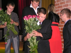 Šiemet baigusieji mokyklą gėlėmis apdovanojo savo grupių vadovus ir pedagogus. Banguolės Aleknienės nuotrauka Linkėjo sėkmingos karjeros Tądien absolventų ir jų mokytojų rankose žydėjo gėlės, nuo scenos sklido gražūs sveikinimo žodžiai, skambėjo eilės ir dainos. Šiemet Kupiškio technologijos ir verslo mokyklą baigė 170 moksleivių. Daugiausia buvo įgijusių apdailininko (statybininko) specialybę – 56. Prekybos įmonių vadybininko padėjėjo kvalifikacijos diplomas įteiktas 31, šaltkalvio remontininko – 20, apskaitininko-kasininko ir padavėjo, barmeno – po 18, kompiuterio ir organizacinės technikos operatoriaus – 15, staliaus – 12. Ne vienas iš šių moksleivių kartu įgijo ir vidurinio mokslo brandos atestatą. Šios mokyklos direktorė Lina Kaušakienė savo sveikinimo kalboje pasidžiaugė gražiu būriu absolventų, tarp kurių nemažas būrelis ir baigusiųjų mokslus su pagyrimu. Jiems palinkėta kryptingai siekti tolesnės karjeros, nenuleisti rankų, jei iš pradžių nesisektų rasti darbo. Jei išliks noras tobulėti, užsidegimas, tai durys bus atviros profesinėje rinkoje. Pasak direktorės, iš šiemetinių absolventų 66 jau dirba, 48 ieško darbo, 29 ketina tęsti studijas aukštojoje mokykloje, 14 pasiryžę laimės ieškoti užsienyje, 12 – jaunos mamos, auginančios vaikučius. Plačiau skaitykite "Kupiškėnų mintyse"