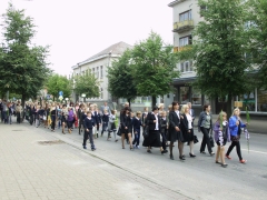 Kupiškio Lauryno Stuokos-Gucevičiaus gimnazijoje šiemet mokslo metus pradės 632 gimnazistai. Autorės nuotrauka Naujovės Šį rugsėjį rajono mokyklos slenkstį iš viso peržengė 2540 mokinių. Pirmą kartą už mokyklinio suolo atsisėdo 177 rajono pirmokėliai (pernai buvo 176 pirmokai). Vaikus mokys apie 330 mokytojų. Pasak Kupiškio r. savivaldybės Kultūros ir švietimo skyriaus vedėjo Rimanto Jociaus, didelio mokytojų sumažėjimo nėra. „Mokytojų darbo krūvis mažėja, tačiau didelio dirbančiųjų skaičiaus pokyčio nėra. Per metus gal 5-6 mokytojai palieka darbą, - sakė R. Jocius. - Konkretų mokytojų skaičių žinosime po kelių savaičių.“ Po šv. Mišių Kupiškio Kristaus Žengimo į dangų bažnyčioje iškilminga mokinių, mokytojų ir tėvelių eisena pasuko mokyklų link. Autorės nuotrauka Naujovė laukia ir Kupiškio Lauryno Stuokos-Gucevičiaus gimnazijos pirmųjų klasių gimnazistų. Visos penkios klasės turės vieną klasės vadovą. Juo bus mokytoja Jūratė Šepetienė. Subačiaus gimnazijoje irgi permainos. Čia atsirado galimybė suformuoti priešmokyklinę grupę, kurioje bus 11 vaikų. Beje, mokyklos, kurios naudojasi elektroniniu dienynu (TAMO), galės savo mokiniams pasiūlyti dar vieną naujovę - daugiafunkcį elektroninį mokinio pažymėjimą, kuriame bus integruotos tokios funkcijos kaip elektroninė mokinio piniginė, socialinio maitinimo apskaita, skaitytojo bilietas ir kt. Tokie pažymėjimai kainuos 12 litų. Subačiaus gimnazijos mokiniai mielai puošiasi savo klasės uniformomis. Ingridos Nagrockienės nuotrauka Į Lietuvos mokyklas šiemet susirinks 371 tūkstantis vaikų, juos mokys apie 27 tūkstančius mokytojų. Nuo 2008-ųjų mokinių Lietuvoje sumažėjo beveik 100 tūkstančių. Pasak švietimo ir mokslo ministro Gintaro Steponavičiaus, šie naujieji mokslo metai liudija prastą demografinę situaciją - į šalies mokyklas šiemet ateis 20 tūkstančių mažiau moksleivių. Dėl to darbo neteks apie tūkstantį mokytojų. Ministerijos duomenimis, šiuos mokslo metus pradeda 1269 savivaldybių ir valstybinės mokyklos, 36 daugiafunkciai centrai ir 36 privačios bendrojo ugdymo mokyklos. Šiemet rugsėjį užvertomis durimis sutinka devynios Lietuvos mokyklos. Tikimasi, kad nuo 2017 m. vaikų mokyklose vėl turėtų padaugėti. Šiais metais darželius lankys daugiau nei 85 tūkstančiai vaikų. Skaičiuojama, kad 79 profesinio mokymo įstaigose mokslo metus pradės daugiau kaip 46 tūkst. moksleivių. Jau priimta per 16 tūkst. moksleivių, jų dar laukiama iki spalio 1 d. Subačiaus gimnazijos abiturientai tradiciškai į pirmąją pamoką palydi savo mokyklos pirmaklasius. Ingridos Nagrockienės nuotrauka