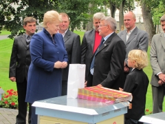 Kupiškio bitininkai į prezidentūrą važiavo ne tuščiomis rankomis – šalies vadovei jie vežė tris avilius. Graži Kupiškio bitininkų ir Lietuvos prezidentės Dalios Grybauskaitės draugystė prasidėjo visai neseniai - ruošiantis respublikinei bitininkų šventei, kuri šiais metais vyko mūsų rajone. Į bitininkų renginius trumpam užsukusi šalies vadovė netikėtai gavo pasiūlymą pasiimti šventės rengėjams padovanotus avilius. Ir prezidentė nepasikuklinusi sutiko priimti net tris tokias dovanas. Kupiškio bitininkai į prezidentūrą važiavo ne tuščiomis rankomis – šalies vadovei jie vežė tris avilius. Šią dovaną nusprendė įteikti trisdešimt aktyviausių mūsų rajono bitininkų su jų draugijos pirmininku Juozu Žeimantu. Visą šią delegaciją savo valdose pasitiko prezidentė ir jos pagalbininkų komanda. Į prezidentūros kiemelį išėjusi D. Grybauskaitė džiaugėsi originalia kupiškėnų dovana ir teigė avilius pasistatysianti savo namų kieme Turniškėse. „Kupiškyje susitikusi su bitininkais, nusprendžiau keletą avilių pasistatyti ir savo namų kieme. Ten daug gražių liepų, ir vasarą tiesiog dūzgia visi medžiai, pilni bičių. Toks turtas - ir visai šalia! Netrukus aviliai bus pastatyti Turniškėse. Tačiau man ir toliau reikės jūsų pagalbos“, - į Kupiškio bitininkus kreipėsi šalies vadovė. Buvo sutarta, kad pirmąsias bičių šeimas prezidentė gaus tik pavasarį. Jas atveš ir nuolat prižiūrės pats bitininkas J. Žeimantas. Kupiškio bitininkai su Lietuvos prezidente Dalia Grybauskaite. Autorės nuotraukos Kupiškėnų aviliai tą pačią dieną buvo nuvežti į prezidentės rezidenciją Turniškėse. O bitininkų draugijai atsidėkota įdomia ekskursija po prezidentūrą bei prezidentės dovanomis. Bičių avilius dovanų iš Ukrainos yra gavęs prezidentas Valdas Adamkus. Juos atidavė bitininkystės muziejui Ignalinos rajone. Bitininkyste domėjosi ir prezidentas Algirdas Brazauskas.