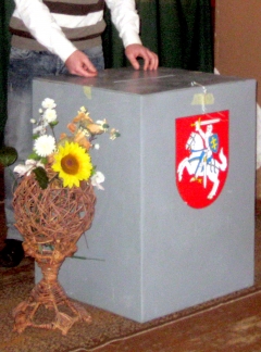 „Daugiau žmonių laukiame prieš arba po šv. Mišių. Apskritai smagu matyti pasitempusius, pasipuošusius žmones, kurie jaučia pareigą atiduoti savo balsą už Lietuvos ateitį“, - sakė Lukonių rinkimų apylinkės komisijos pirmininkės pavaduotoja Zita Kaušakienė. Tačiau lūkuriuojant Lukonių rinkimų apylinkėje matėsi ir ne itin atsakingai nusiteikusių rinkėjų. Kai kurie jų atėjo smagiai atšventę ir net rinkimų kortelės neturėjo. Viena rinkimų komisijos narių pasakojo, kad praeityje būdavo ir didesnių „cirkų“, kai viena apylinkės gyventojų į rinkimus atsivedė gyvą ožį. O šalia pastato, kur vyko rinkimai, pakabino medžiaginį pakaruoklį. Minėta rinkėja smaginosi ir prieš šiuos rinkimus: plėšė nemėgstamų kandidatų į Seimą plakatus, o vietoje jų kabino savo eilėmis padabintus plakatus. Apie 11 val. Kupiškio Kupos rinkimų apylinkėje nusidriekė rinkėjų eilė ir prie biuletenių išdavimo, ir prie balsavimo kabinų. Banguolės Aleknienės nuotrauka Po dešimtos, kai bažnyčioje baigėsi rytinės šv. Mišios, visose Kupiškyje įsikūrusiose rinkimų apylinkėse pastebimai padaugėjo savo pilietinę pareigą atlikti atėjusių žmonių. Antai Senamiesčio rinkimų apylinkėje apie 11.30 val. jau balsavo 226 rinkėjai (iš 1415), Kupos rinkimų apylinkėje – 260 (iš 1860) arba 13 proc. , Račiupėnų rinkimų apylinkėje 415 (iš 2965), Aukštupėnų rinkimų apylinkėje – 112 (iš 718). Gauti duomenys iš dviejų kaimo vietovių byloja, jog ten kol kas gyventojai rinkti naujojo Seimo ir pareikšti savo nuomonės dėl atominės elektrinės eina labai vangiai. Biliūnu rinkimų apylinkėje iš 217 rinkėjų likus pusvalandžiui iki vidurdienio atėjo tik 19, o Juodpėnų rinkimų apylinkėje iš 283 – 45. Kupos rinkimų apylinkės pirmininkė Laimutė Bernadickienė. Banguolės Aleknienės nuotrauka Kupos rinkimų apylinkės pirmininkė Laimutė Bernadickienė, turinti ilgametę darbo rinkimų komisijose patirtį, sakė, kad Kupiškio gyventojai tradiciškai aktyviausiai balsuoja po šv. Mišių bažnyčioje. Antroji aktyvumo banga būna po pietų, kai ateina ilgiau savaitgaliniu miegu pasilepinęs jaunimas. Pastaraisiais metais pastebima, jog rinkėjai išmoko reitinguoti, daugiau kreipia dėmesio į asmenybes. Jonas ir Laimutė Kalendros seimūnams, kurie bus išrinkti linkėjo sąžiningumo ir drąsos gyventi gaunant mažesnes algas. Banguolės Aleknienės nuotrauka L. Bernadickienė sakė, kad per šiuos rinkimus rinkimų komisijoms skirtas palyginti nedidelis finansavimas. Antai ji pati telefono išlaidoms padengti gavo 16 Lt. Tai lašas jūroje. Bet iš pirmininko atlyginimo užteks toms išlaidoms padengti. Neskirta lėšų pirmą kartą balsuojančiųjų dovanėlėms. Tad ši rinkėjų grupė nebėra išskiriama. Anksčiau jos atstovai gaudavo dovanų Konstituciją, būdavo įteikiamas gėlės žiedas.