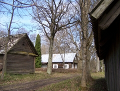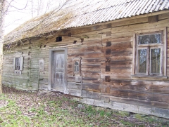Jurėniškių gatvinio kaimo pastatai. Petro Laužiko namas (troba) ir klėtis kairėje. 2009 m. Aušros Jonušytės nuotraukos. Kupiškio etnografijos muziejaus rinkiniai