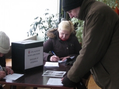 Rinkėjai pildo Rinkėjo anketą. Račiupėnų rinkimų apylinkėje balsavę Valdas ir Laima Baltušiai buvo linkę manyti, kad visgi be antrojo rinkimų turo neapsieisime. „Aš balsavau už tą patį kandidatą kaip ir pirmą kartą. Bet netikiu, kad iš vienuolikos kandidatų kuris nors vienas surinktų didžiąją daugumą rinkėjų balsų“, – sakė moteris. Jos vyras pridūrė, kad Kupiškio rajonui reikia savo seimūno. Kažin ar biržiečiui bus svetimi marškiniai arčiau kūno? „Paradoksalu, mažėjant rajone žmonių, turime net du mūsų kraštui atstovaujančius Seimo narius. Ar negeriau būtų vienas? Kažkaip tas proporcijas reikėtų perskaičiuoti“, – svarstė jis.