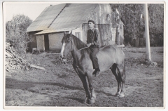 Kazimieras Zulonas savo sodyboje Pajuodupės kaime raitas ant mylimo arklio. Apie 1960–1961 m. Iš Genovaitės Domžaitės-Zulonienės albumo. Kupiškio etnografijos muziejaus rinkiniai